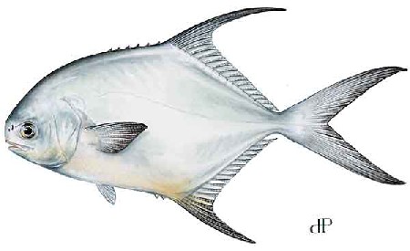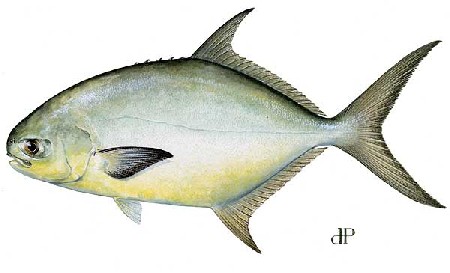 Pompano - The Florida pompano is one of the best eating fish found in inshore waters. They average a little over a pound and rarely get over five pounds, but fight like fish twice their size. A member of the jack family, pompano better resemble permit than jack crevalles for their table qualities as well as their fight. They are tough fish on light tackle and fly, and willing to eat everything from a live sandflea to a Nylure jig.